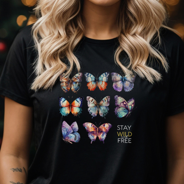 Osm krásných pastelových motýlů a nápis STRAY WILD and FREE. Co takhle uletět ze stereotypu a ukázat, že ve vás žije nespoutaná duše! Řekněte to tričkem!